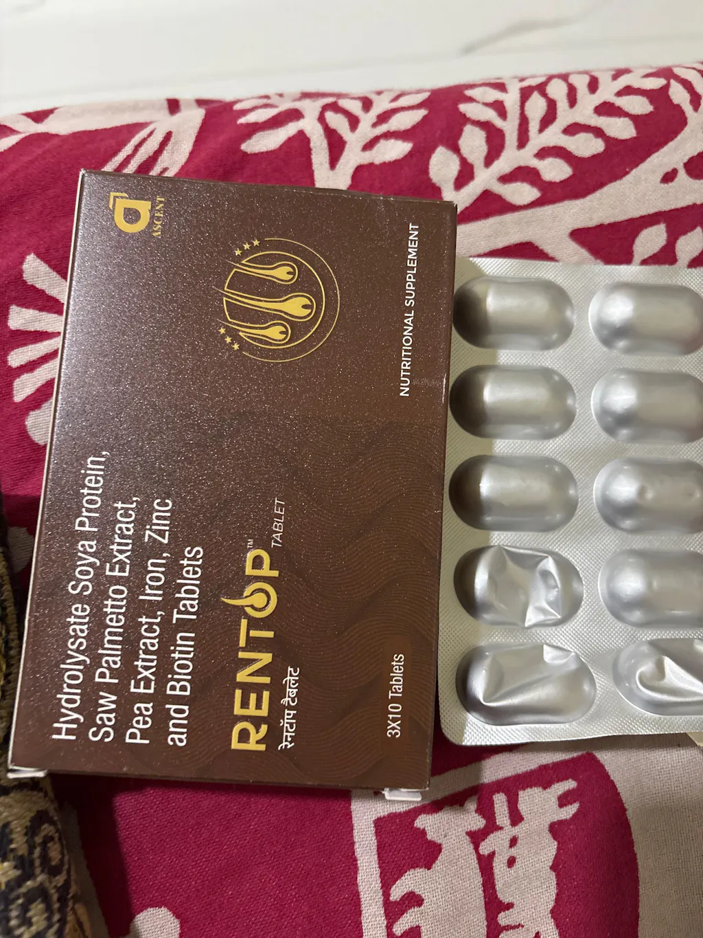 Rentop Tablet is a specialized nutritional supplement formulated to provide deep-rooted nourishment for hair vitality. Featuring a potent blend of Saw Palmetto, Biotin, and 15 Essential Amino Acids, it supports the natural hair growth cycle and maintains scalp health from within. This dermatologically balanced formula is enriched with Hydrolyzed Soy Protein and Green Tea Extract to protect against oxidative stress while strengthening the hair's keratin structure. Designed for daily use, Rentop addresses micronutrient gaps, helping you maintain fuller, thicker, and more resilient hair.